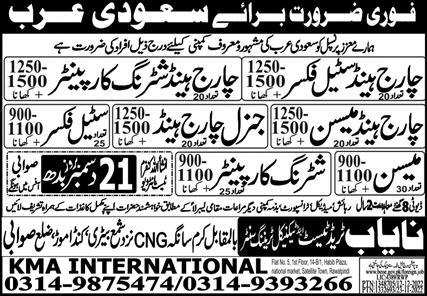 KMA International Overseas Employment Riyadh, riyadh Saudi Arabia invites applications from eligible candidates for the post of mason, shuttering carpenter, general charge hand, steel fixer, charge hand steel fixer, charge hand shuttering carpenter and charge hand mason as per advertisement of December 17, 2022 published in daily Express Newspaper. Educational qualifications required Matric, Middle and Primary etc.