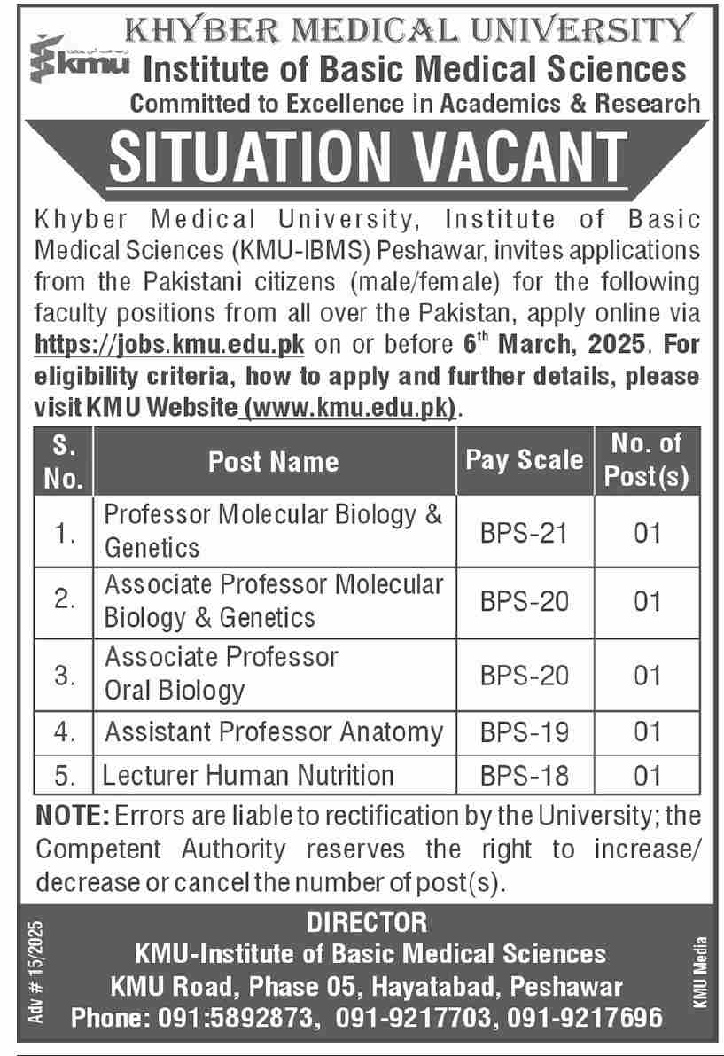 Khyber Medical University Peshawar Peshawar, peshawar Khyber Pakhtunkhwa KPK Pakistan invites applications from eligible candidates for the post of lecturer, professor, associate professor and assistant professor as per advertisement of February 13, 2025 published in daily Dawn Newspaper. Others, MS, Mphil, Phd and Master etc. educational qualification will be preferred.