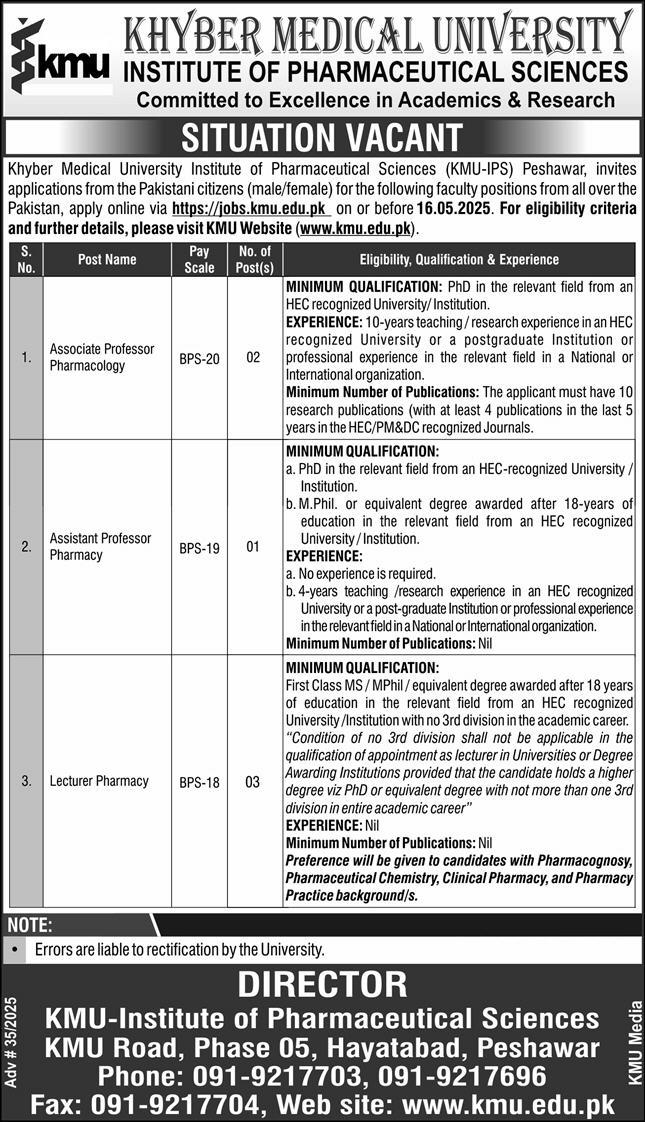 Khyber Medical University KMU invites applications for job positions advertised in daily Express dated 26 April 2025 for following vacancies in Hayatabad Peshawar, peshawar Khyber Pakhtunkhwa KPK Pakistan.