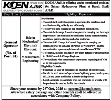 KOEN AJ&K Kotli, kotli AJK Pakistan invites applications from eligible candidates for the post of general operator as per advertisement of October 16, 2025 published in daily Nawaiwaqt Newspaper. Preferred Education is Bachelor etc.