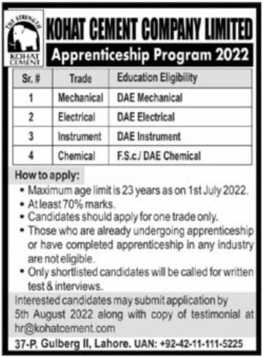 Kohat Cement Company Limited Apprenticeship Program 2022