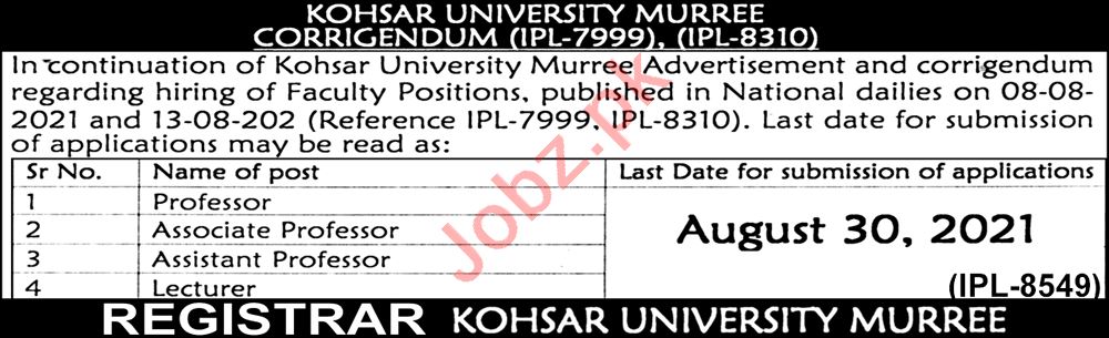 Kohsar University Murree Jobs 2021 for Professor & Lecturer