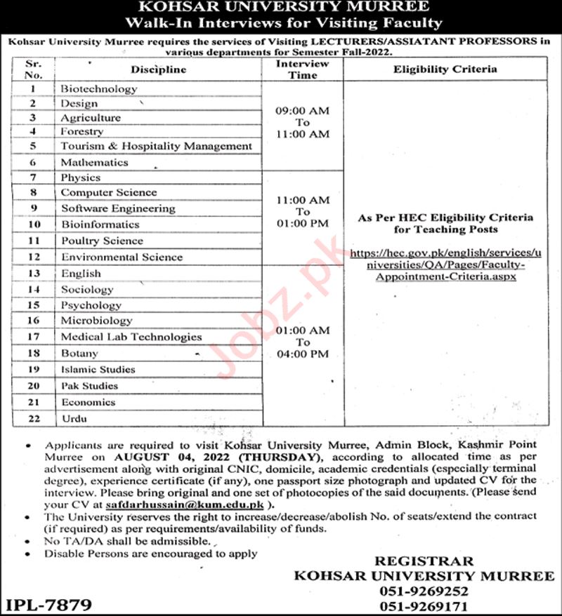 Kohsar University jobs advertisement dated about 31 July 2022 in daily Nawaiwaqt Newspaper invites application for the vacant post of lecturer and assistant professor in Murree, murree Punjab Pakistan. Preferred Education is MS, Phd and Mphil etc.