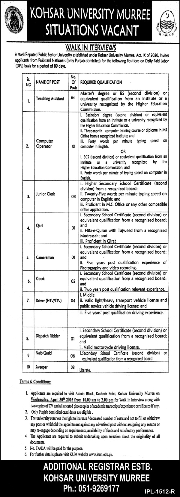 Kohsar University invites applications for job positions advertised in daily Nation dated 25 April 2025 for following vacancies in Murree, murree Punjab Pakistan.