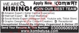 Kombat USA jobs advertisement dated about 8 September 2024 in daily Jang Newspaper invites application for the vacant post of social media expert, amazon expert, graphic designer and walmart expert in Lahore, lahore Punjab Pakistan. MS, Bachelor and Master etc. educational qualification will be preferred.