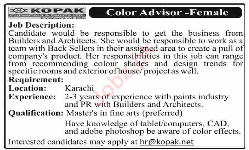 Vacant posts including female color advisor and color advisor are announced in Kopak Chemicals and Paints Limited Karachi, karachi Sindh Pakistan as per 10 April 2023 advertisement in daily Dawn Newspaper. Preferred Education is BA, Master, Bachelor and MS etc.