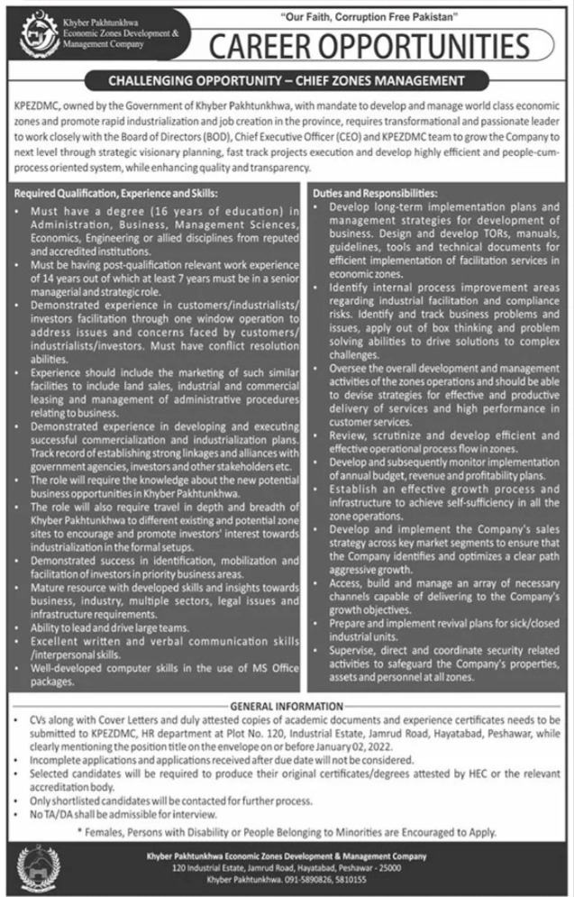 Vacancies in Khyber Pakhtunkhwa Economic Zones Development and Company KPEZDMC Advertisement December 2021