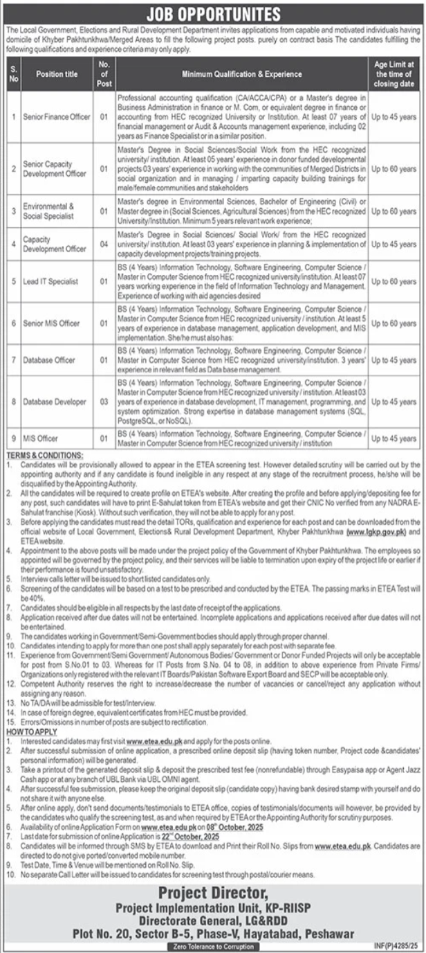 Local Government and Rural Development Department latest Government Management jobs and others can be applied till October 22, 2025 or as per closing date in newspaper ad. Read complete ad online via ETEA to know how to apply on latest Local Government and Rural Development Department job opportunities.