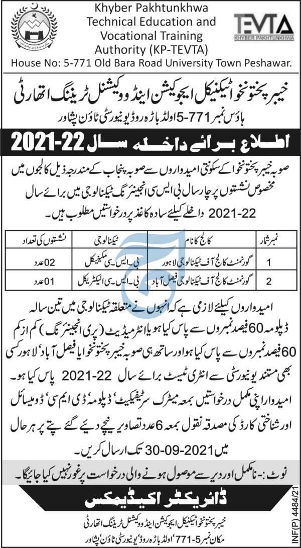 Khyber Pakhtunkhwa Technical Education & Vocational Training Authority TEVTA KP-TEVTA invited application for admissions in Bachelor of Science BSc Engineering Technology in Peshawar KPK 2021-2022. Read newspaper ad for exact details.
