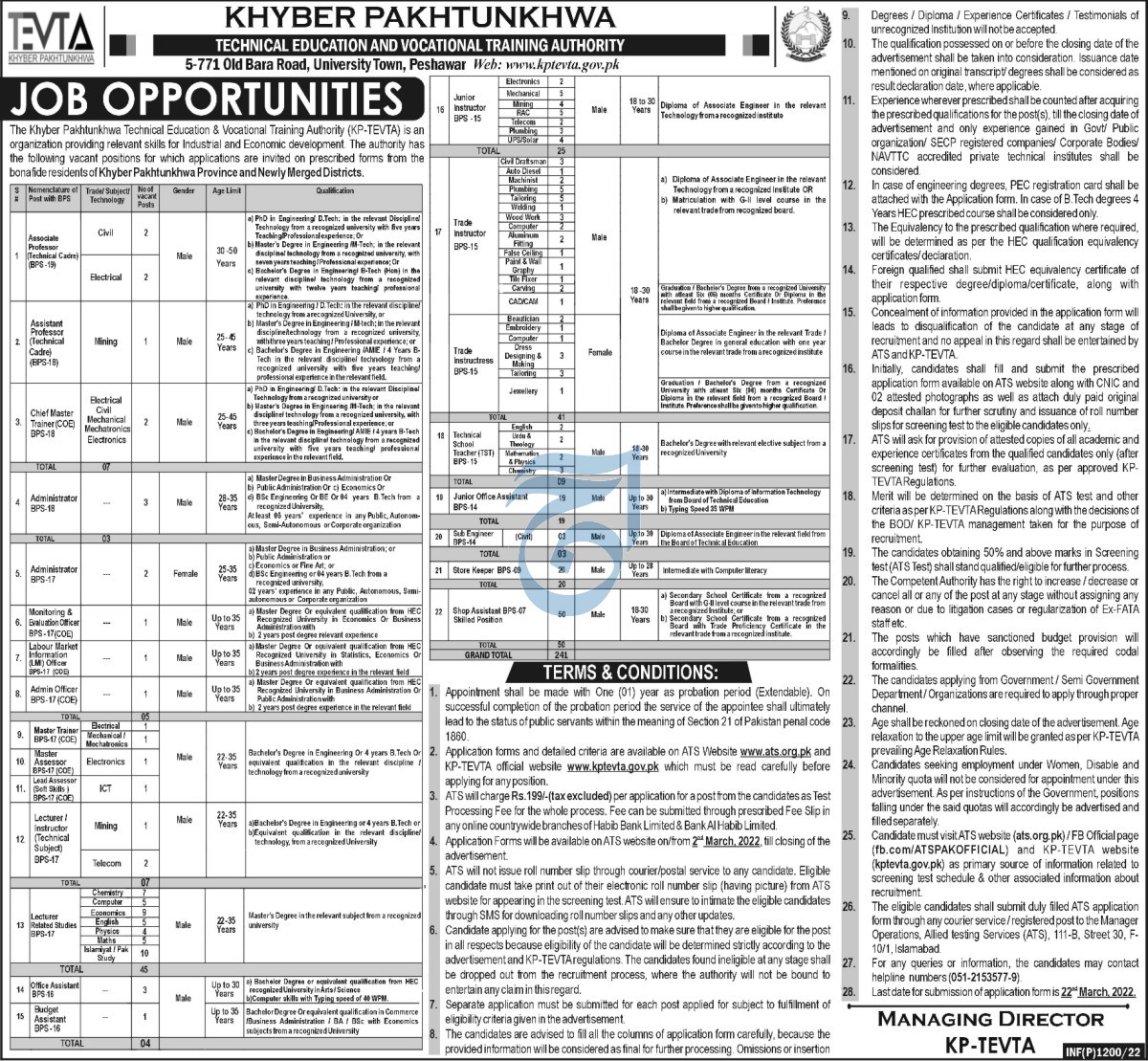 Vacant posts including shop assistant, technical school teacher, assistant professor technical cadre, trade instructress, budget assistant, instructor, jr office assistant, administrator, office assistant, admin officer, labor market information officer, trade instructor, sub engineer, monitoring evaluation officer, llecturer, associate professor technical cadre, store keeper and chief master trainer are announced in KP Tevta System Of Technician & Vocational Education & Training STVET Peshawar, peshawar Khyber Pakhtunkhwa KPK Pakistan as per 27 February 2022 advertisement in daily Aaj Newspaper. Candidates with Matric, MS, Intermediate, Bachelor, Phd and DAE etc. educational background will be preferred.