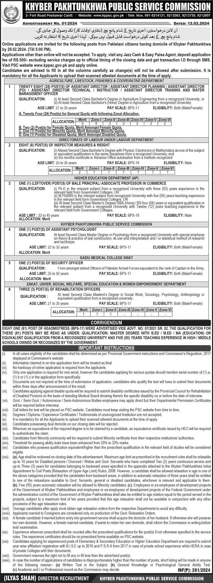 Khyber Pakhtunkhwa Public Service Commission KPPSC jobs advertisement dated about 15 February 2024 in daily The News Newspaper invites application for the vacant post of insopector measure weight, instructor, principal, assistant director finance office, rehabilitation officer, security officer, assistant director planning, assistant director, associate professor, assistant director technical, associate professor commerce, headmistress, assistant director training water management officer and assistant psychologist in Peshawar, peshawar Khyber Pakhtunkhwa KPK Pakistan. Educational qualifications required M.ed, Master, MA, Mphil, Phd, Bachelor, M.sc, MS and B.ed etc.