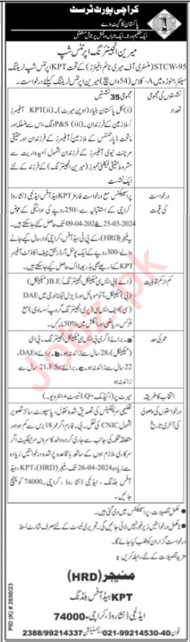 Karachi Port Trust Karachi, karachi Sindh Pakistan invites applications from eligible candidates for the post of marine engineering apprenticeship as per advertisement of March 24, 2024 published in daily Jang Newspaper. Persons with Intermediate and Bachelor etc. education can apply.