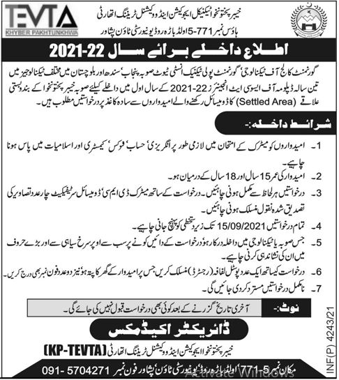 Khyber Pakhtunkhwa Technical Education & Vocational Training Authority KPTEVTA has announced admissions in Diploma of Associate Engineer DAE 2021-2022. Read newspaper ad for exact details.
