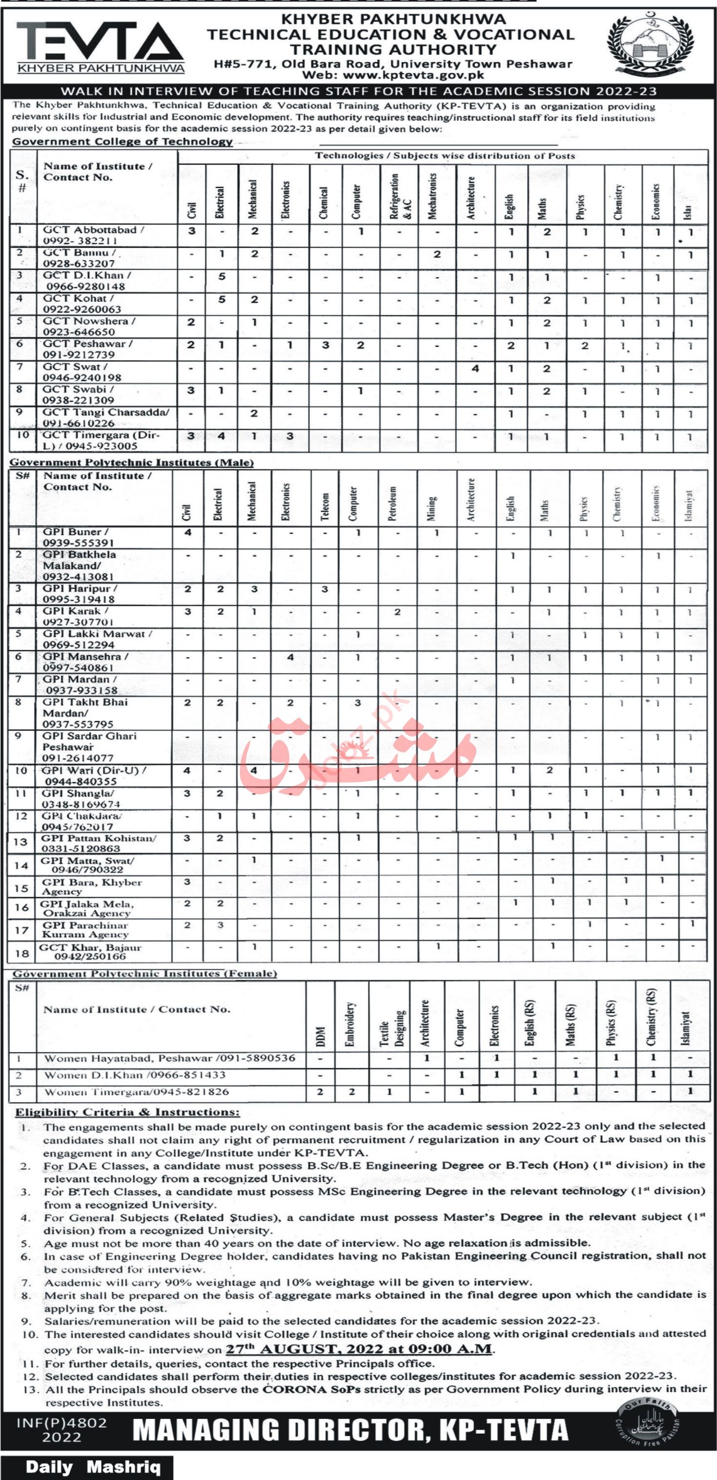 Technical Education & Vocational Training Authority KPTEVTA is looking for candidates for following posts as per job advertisement published in daily Mashriq Newspaper of August 21, 2022 for location Peshawar, lower dir, dera ismail khan, karak, swabi, batkhela, mardan, mansehra, lakki marwat, shangla, upper dir, nowshera, peshawar, buner, swat, bannu, abbottabad, budapest, kohat, charsadda, kohistan and parachinar Khyber Pakhtunkhwa KPK Pakistan: