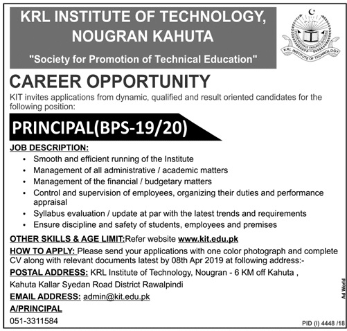 Vacancies in KRL Institute of Technology Advertisement March 2019