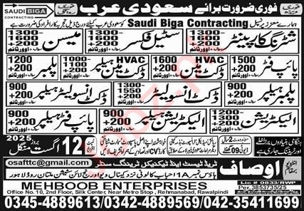 Ausaf Trade Test & Technical Training Center jobs advertisement dated about 11 August 2025 in daily Express Newspaper invites application for the vacant post of Duct Insulator Helper, Plumber Helper, Shuttering Carpenter, Electrician Helper, Steel Fixer, Pipe Fitter Helper, Pipe Fitter, Hvac Duct Man, Mason, Plumber, Hvac Duct Man Helper, Duct Insulator and Electrician in Riyadh, riyadh Saudi Arabia. Intermediate, Middle and Matric etc. educational qualification will be preferred.