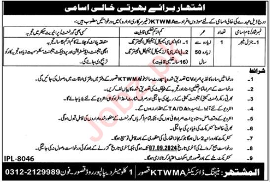 Kasur Tanneries Waste Management Agency KTWMA Kasur, kasur Punjab Pakistan invites applications from eligible candidates for the post of general manager as per advertisement of August 25, 2024 published in daily Jang Newspaper. Master etc. educational qualification will be preferred.