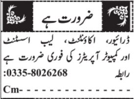 Vacant posts including driver, accountant, computer operator and lab assistant are announced in Private Company Quetta, quetta Balochistan Pakistan as per 5 July 2023 advertisement in daily Jang Newspaper. Preferred Education is BA, I.com, Intermediate, Matric, BBA, B.com, Bachelor and Middle etc.