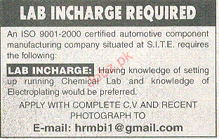 Lab Incharge Job Opportunity