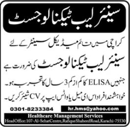 Medical Center jobs advertisement dated about 20 October 2024 in daily Jang Newspaper invites application for the vacant post of lab technologist in Karachi, karachi Sindh Pakistan. Educational qualifications required Intermediate and Bachelor etc.