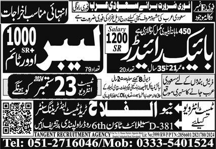 Vacant posts including rider, labor and bike rider are announced in Tangent Recruiting Agency Riyadh, madina Saudi Arabia as per 14 September 2024 advertisement in daily Express Newspaper. Preferred Education is Middle and Matric etc.