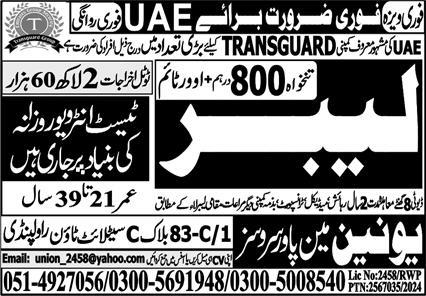 Vacant posts including labor are announced in Union Manpower Services Abu Dhabi, sharjah UAE as per 15 August 2024 advertisement in daily Express Newspaper. Persons with Matric and Middle etc. education can apply.