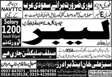 Apply at Sabz Ali Khan & Brothers Overseas Employment Promoters latest Overseas jobs in Labor and departments before closing date which is around November 14, 2025 or as per closing date in newspaper ad. Read complete ad online to know how to apply on latest Sabz Ali Khan & Brothers Overseas Employment Promoters job opportunities. Salary varies from 90000.