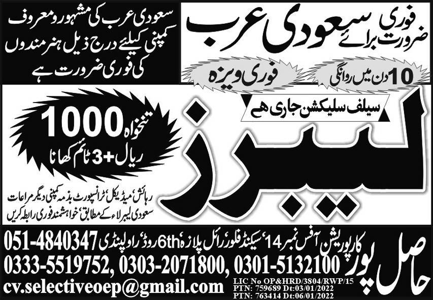 Hasilpur Corporation jobs advertisement dated about 21 March 2022 in daily Express Newspaper invites application for the vacant post of labor in Dammam, dammam Saudi Arabia. Candidates with Middle and Matric etc. educational background will be preferred.
