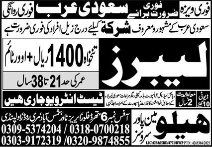 Hello Manpower Services is looking for candidates for following posts as per job advertisement published in daily Express Newspaper of November 30, 2025 for location Riyadh, riyadh Saudi Arabia: