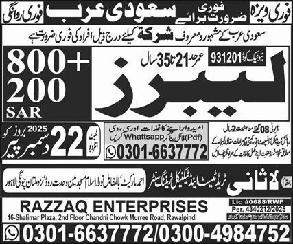 Razzaq Enterprises Riyadh, riyadh Saudi Arabia invites applications from eligible candidates for the post of labor as per advertisement of December 14, 2025 published in daily Express Newspaper. Preferred Education is Middle etc.