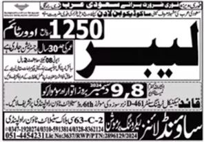 Sound Lines Recruiting Promotion Jeddah, dammam Saudi Arabia invites applications from eligible candidates for the post of labor as per advertisement of December 5, 2024 published in daily Dunya Newspaper. Intermediate, Middle and Matric etc. educational qualification will be preferred.