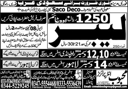 Vacant posts including labor are announced in Mehboob Enterprises Overseas Employment Promoters Riyadh, makkah Saudi Arabia as per 7 December 2024 advertisement in daily Express Newspaper. Persons with Intermediate, Matric and Middle etc. education can apply.