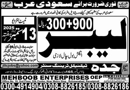Vacant posts including labor are announced in Jeddah Technical Trade Center Jeddah, dammam Saudi Arabia as per 12 September 2025 advertisement in daily Express Newspaper. Persons with Matric and Middle etc. education can apply.