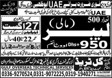 Gul Trade Test & Technical Center Sharjah, abu dhabi UAE invites applications from eligible candidates for the post of labor and mali as per advertisement of August 27, 2025 published in daily Express Newspaper. Candidates with Middle and Matric etc. educational background will be preferred.