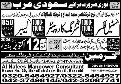 Vacant posts including shuttering carpenter, steel fixer and labor are announced in Harmain Trade Test & Technical Training Center Jeddah, tabuk Saudi Arabia as per 10 October 2024 advertisement in daily Express Newspaper. Educational qualifications required Middle, Intermediate and Matric etc.