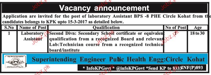 Laboratory Assistants are required in Public Heath Engineering Department in Kohat.