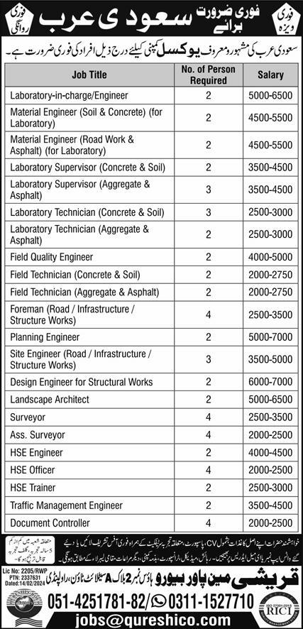 Qureshi Manpower Bureau jobs advertisement dated about 17 February 2024 in daily Express Newspaper invites application for the vacant post of laboratory technician, landscape architect, traffic management engineer, material engineer, foreman, laboratory engineer, hse officer, hse engineer, planning engineer, hse trainer, field quality engineer, site engineer, surveyor, design engineer, laboratory supervisor, laboratory incharge, assistant surveyor, field technician and document controller in Riyadh, riyadh Saudi Arabia. Bachelor and Intermediate etc. educational qualification will be preferred.
