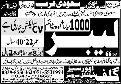 Gulf Overseas Technical Services Riyadh, riyadh Saudi Arabia invites applications from eligible candidates for the post of labors as per advertisement of July 28, 2025 published in daily Express Newspaper. Persons with Middle and Primary etc. education can apply.
