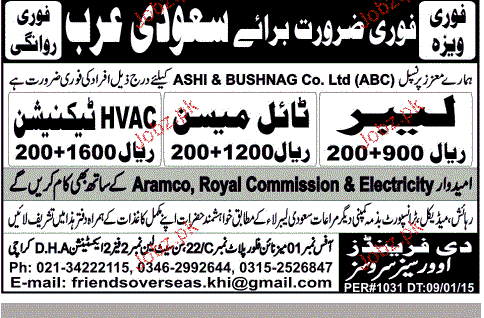 Labors, Tile Mason and HVAC Technicians Job Opportunity
