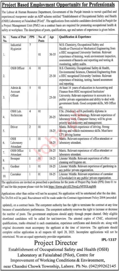 Labour & Human Resource Department jobs advertisement dated about 14 April 2025 in daily Jang Newspaper invites application for the vacant post of Ltc Driver, Osh Officer, Sweeper, Industrial Hygienist, Htv Driver, Osh Lab Technician, Gardener, Accounts Officer, Admin Officer, Osh Laboratory Attendant, Caretaker and Driver in Lahore, lahore Punjab Pakistan. Educational qualifications required Intermediate, MS, Master, Middle, Bachelor and Matric etc.