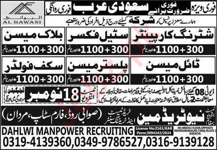 Vacant posts including Tile Mason, Steel Fixer, Shuttering Carpenter, Plaster Mason, Block Mason and Scuff Folder are announced in Dahlwi Manpower Recruiting Riyadh, riyadh Saudi Arabia as per 17 November 2024 advertisement in daily Express Newspaper. Candidates with Middle, Matric, Intermediate and Primary etc. educational background will be preferred.