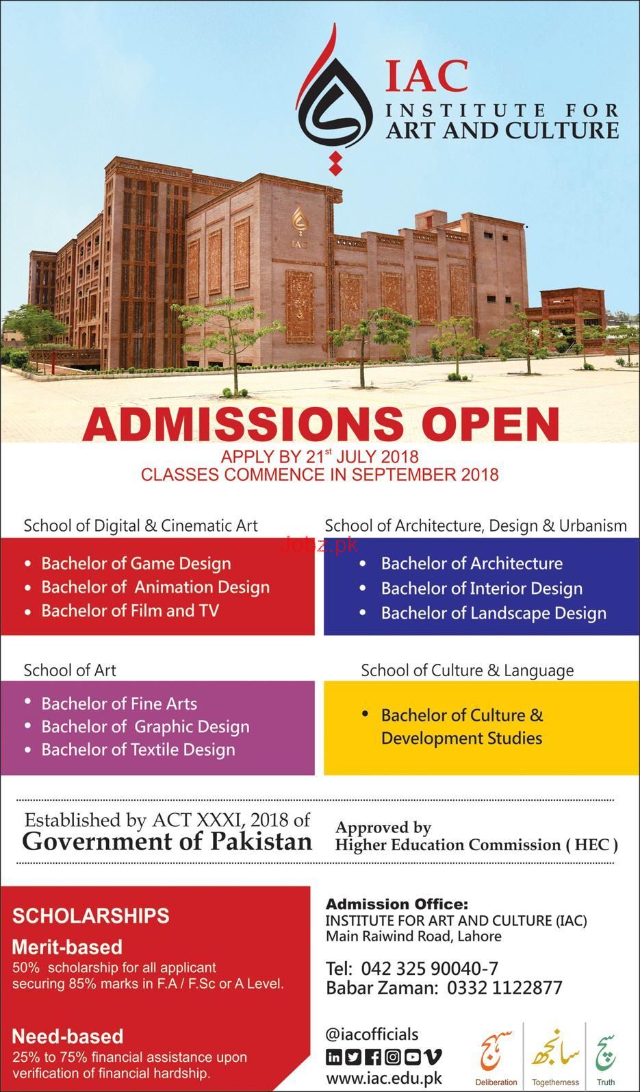LAC Institute For ART and Culture Admission in Bacelor of Game Design, Bachelor of Animation Design, Bachelor of Film & TV, Bachelor of Architecture and Bachelor of Interior Design in Lahore. Read newspaper ad for exact details.
