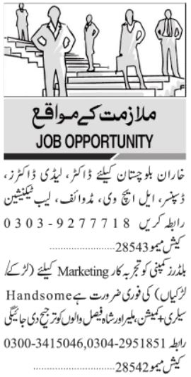 Lady Doctor And Marketing Staff Jobs In Karachi
