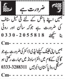 Hospital Clinic jobs advertisement dated about 29 August 2023 in daily Jang Newspaper invites application for the vacant post of lady doctor, cook, doctor and hostel worker in Quetta, quetta Balochistan Pakistan. Persons with Middle, Matric and MBBS etc. education can apply.