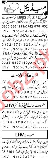 ENT Specialist, Eye Specialist, Child Specialist, Medical Officer, Radiologist, Nurse, LHV, Doctor, Lady Doctor, Pharmacist, Midwife, Gynecologist, Receptionist, Dispenser, Resident Medical Officer, Pathologist, General Manager, Admin Assistant seeks in well progressive hospitals.