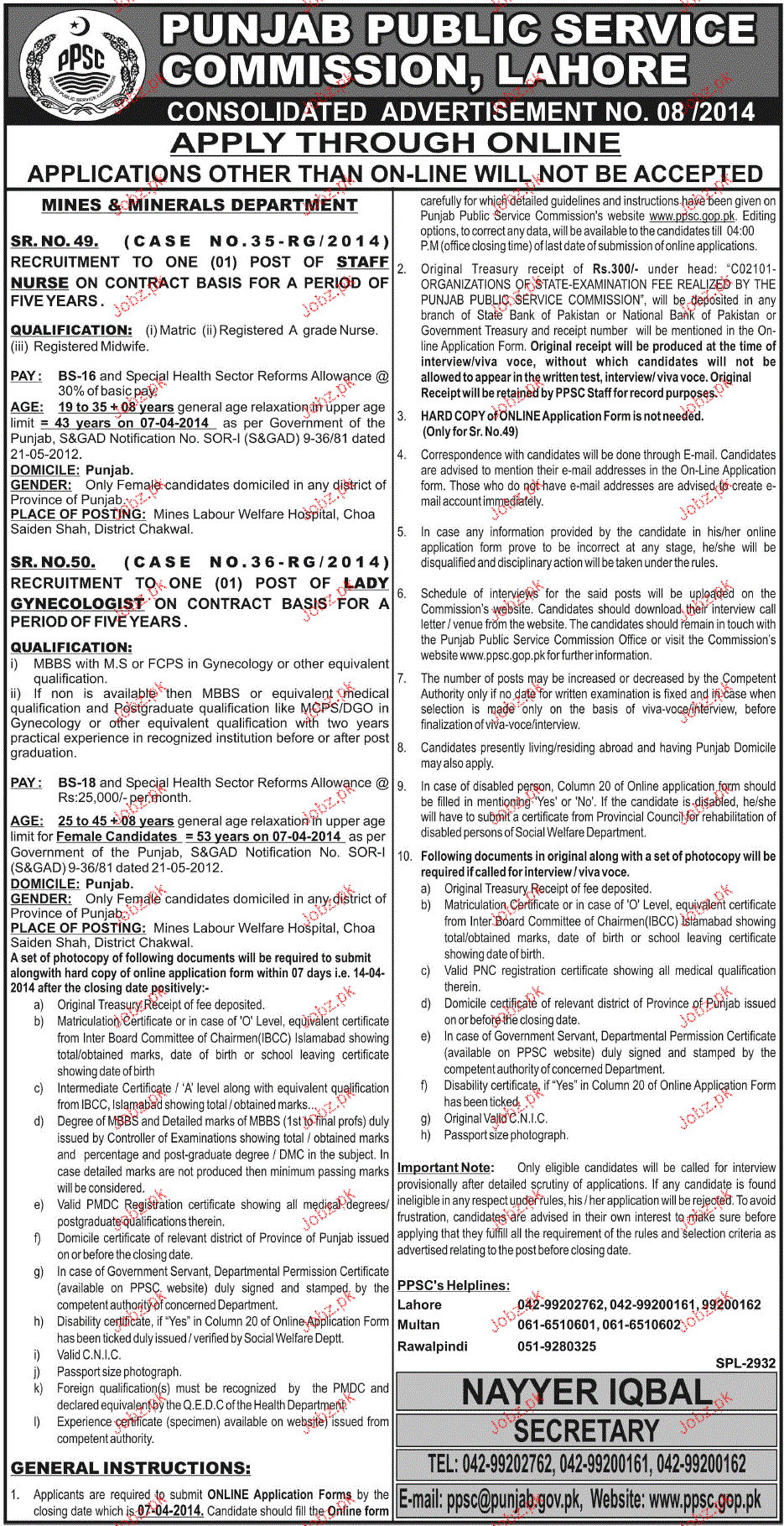 Lady Gynecologist and Staff Nurses are required in Punjab Public Service Commission in Lahore