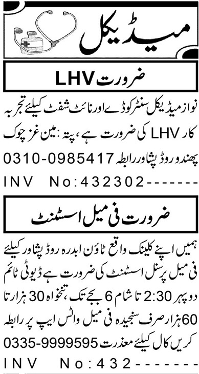 MEDICAL PRIVATE Peshawar, peshawar Khyber Pakhtunkhwa KPK Pakistan invites applications from eligible candidates for the post of female assistant and lady health visitor lhv as per advertisement of July 3, 2024 published in daily Aaj Newspaper. Candidates with Others, Intermediate, MBBS and Matric etc. educational background will be preferred.