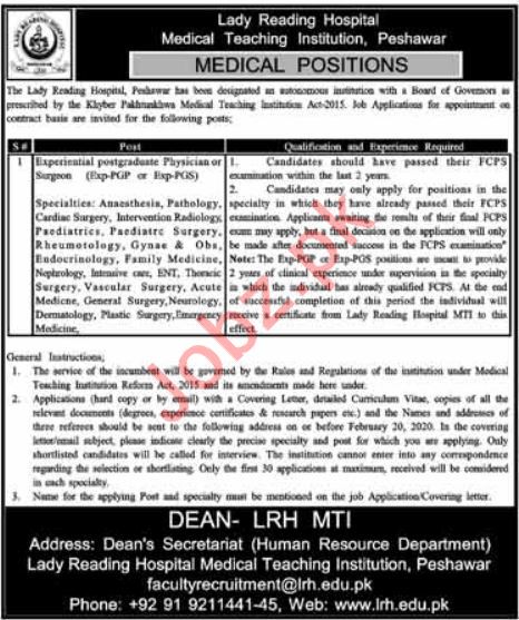 Lady Reading Hospital LRH Medical Teaching Institution MTI is seeking applications from medical, health, mbbs, doctors and experienced candidates for the posts of Experiential Postgraduate Physician, Experiential Postgraduate Surgeon, Anesthesia Surgeon, Pathology Surgeon, Cardiac Surgery Surgeon, Intervention Radiology Surgeon, Paediatrics Surgeon, Paediatric Surgery Surgeon, Rheumatology Specialist, Gynae & Obs Surgeon, Endocrinology Surgeon, Family Medicine Surgeon, Nephrology Surgeon, Intensive Care Surgeon, ENT Surgeon, Thoracic Surgery Surgeon, Vascular Surgery Surgeon, Acute Medicine Surgeon, General Surgery Surgeon, Neurology Surgeon, Dermatology Surgeon, Plastic Surgery Surgeon and Emergency Medicine Surgeon in Peshawar KPK 2020.