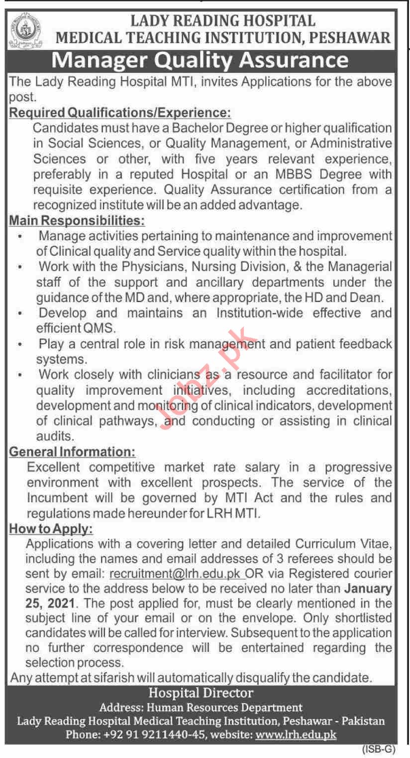 Lady Reading Hospital LRH Peshawar Jobs 2021 For Manager QA