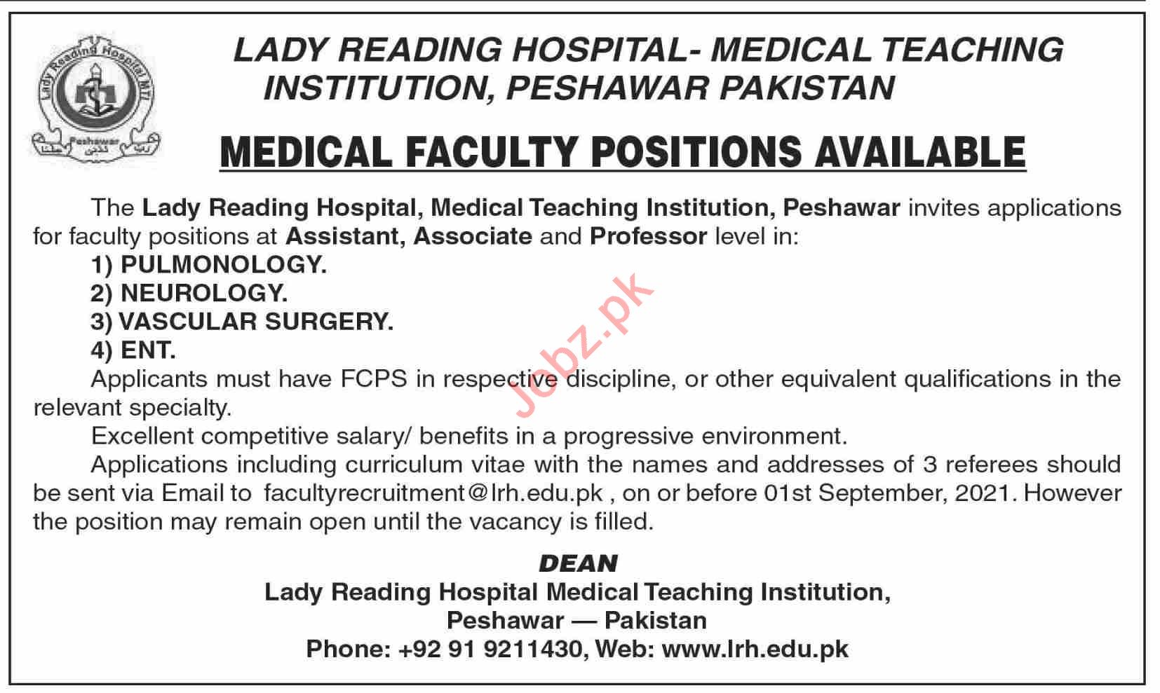 Lady Reading Hospital LRH Peshawar, Medical Teaching Institution MTI, Government of the KPK is seeking candidates for the posts of Professor, Associate Professor, Assistant Professor, Lecturer, Professor Pulmonology, Professor Neurology, Professor Vascular Surgery, Professor ENT.